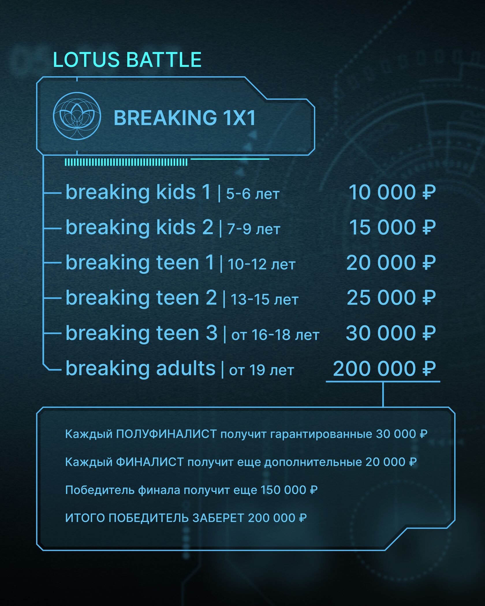 breaking kids 1 | 5-6 лет — 10 000₽ breaking kids 2 | 7-9 лет — 15 000₽ breaking teen 1 | 10-12 лет — 20 000₽ breaking teen 2 | 13-15 лет — 25 000₽ breaking teen 3 | 16-18 лет — 30 000₽ breaking adults | от 19 лет — 200 000₽