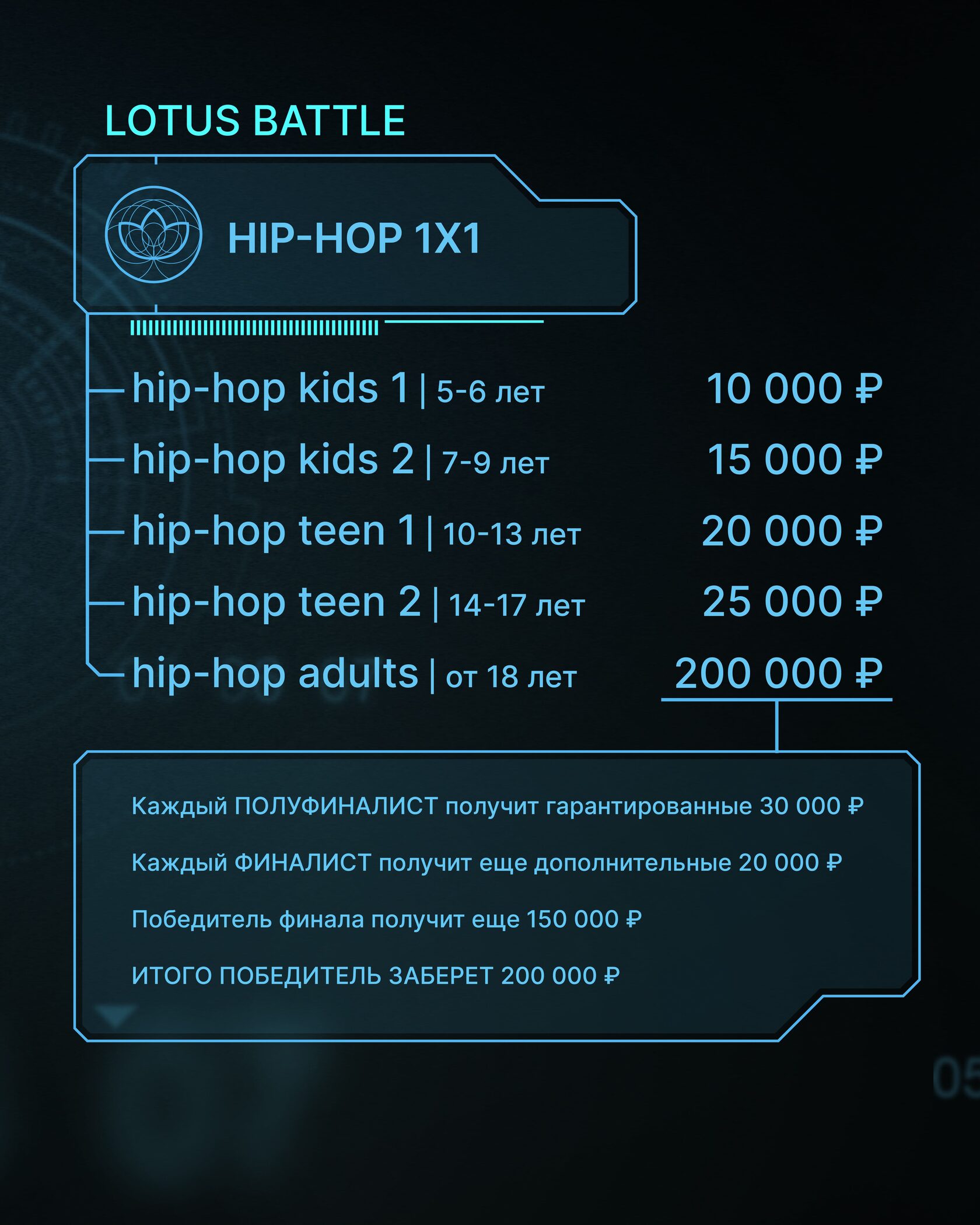 hip-hop kids 1 | 5-6 лет — 10 000₽ hip-hop kids 2 | 7-9 лет — 15 000₽ hip-hop teen 1 | 10-13 лет — 20 000₽ hip-hop teen 2 | 14-17 лет — 25 000₽ hip-hop adults | от 18 лет — 200 000₽ all styles | все возраста — 200 000₽